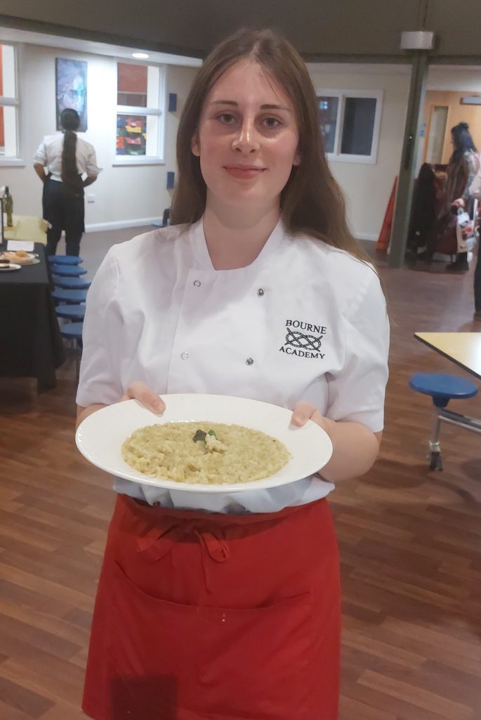 Third prize went to Sophia Campbell of Bourne Academy for their meal titled ‘An Evening in Italy’. This consisted of a pea and mint risotto with parmesan cylinders, with a mango rose tart dessert.